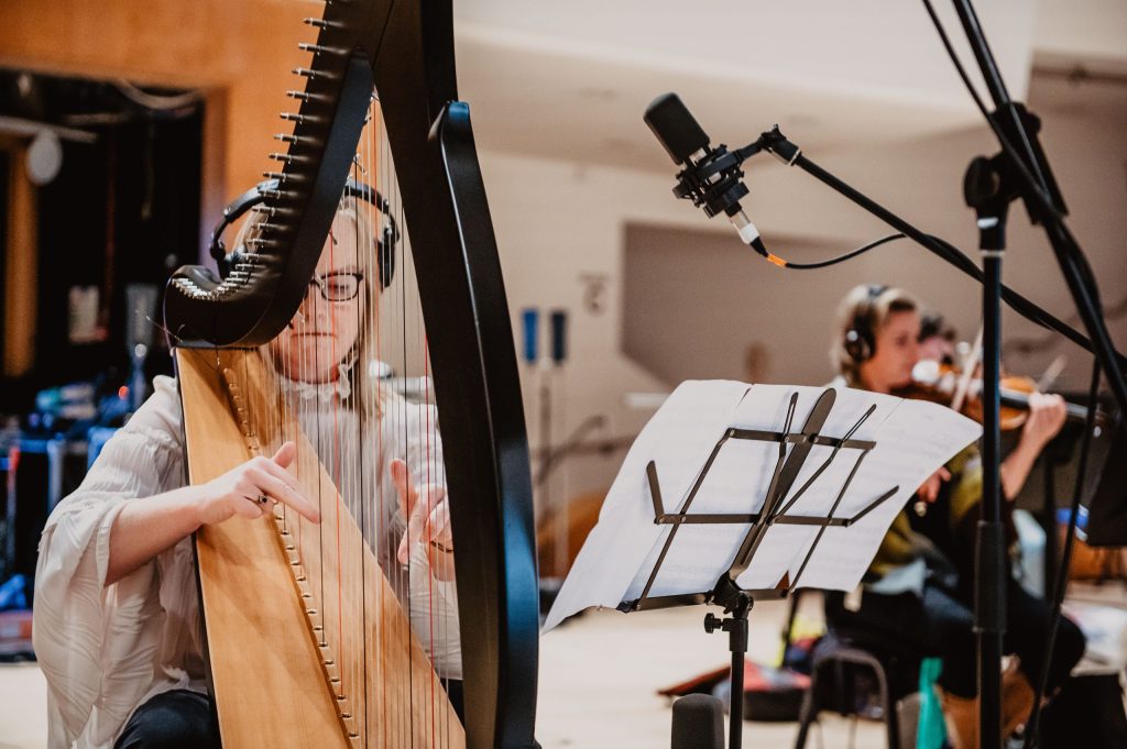 Composer and harper Emer Kenny has released the song ‘Bright Star’, inspired by the stories of Ukrainian women who fled the war in Ukraine and are now living in Dundalk. Emer developed this project during her time as musician in residence in An Táin Theatre Dundalk. The song was recorded with producer and engineer John Murphy, capturing Emer’s distinctive harp playing and emotional vocal performance. The video for Bright Star features contemporary dancer Polina from Donetsk and also harpist Rosie Murphy, John and Emer’s daughter, performing in An Táin Theatre. Iryna, Yara and Maryna from conflict zones in Ukraine who shared their stories with Emer, feature as audience members in the video. The video also includes frontline footage from Ukraine, filmed by the video director, Finn Boylan who is a documentary film maker in areas of conflict globally.