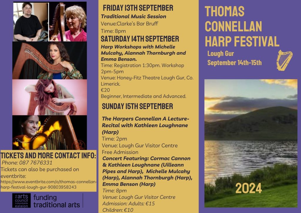 The Thomas Connellan Harp Festival in Lough Gur takes place the 13th - 15th of September. There is stellar line up of some of the best harp players in the country. The festival celebrates Lough Gur's link with famous harper and composer Thomas Connellan. Connellan is said to have died at Bouchier's Castle in 1698 and to be buried in Teampall Nua.