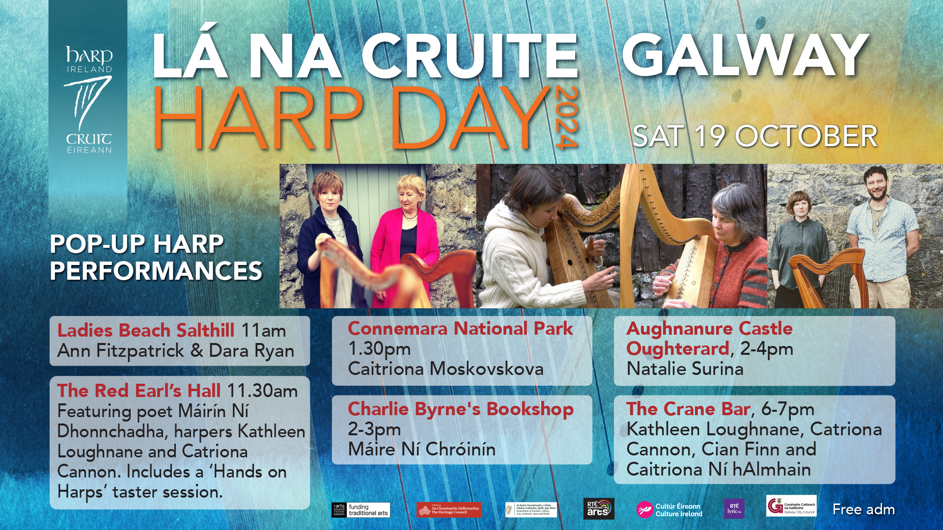 Our thanks to our funders for their support - The Arts Council, The Heritage Council, Local Authority Arts Offices and Libraries countrywide,  RTÉ Supporting the Arts and RTÉ lyric fm. Without your help this would not happen.