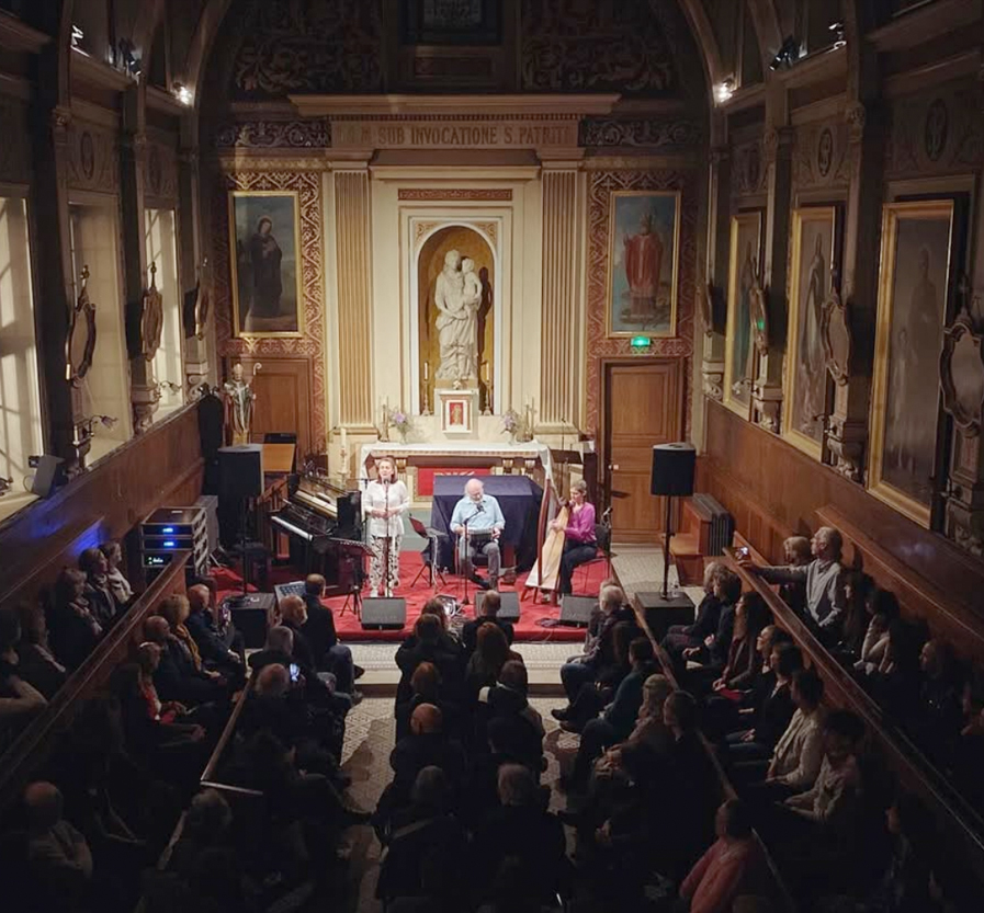 Eilís Lavelle, Cruit Éireann|Harp Ireland artist-in-residence at Centre Culturel Irlandais, opened the concert with traditional harp music before joining Niall Vallely and Karan Casey on stage to perform together.