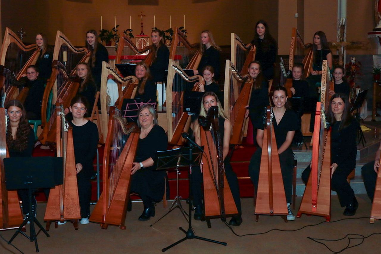 Lunchtime Harp Concert with Cruitirí Loch Garman/Wexford Harp Ensemble in St. Michael’s Church, Gorey. Special guests included the ‘Mothers and Others’ Ensemble and ‘Dads and Lads’ Ensemble. The concert was streamed on the parish webcam.Members of the ensemble celebrated Harp Day by also hosting pop-up concerts across Wexford in quite the unusual settings including fields with animals, the Gorey Rangers grounds, The Old Mill in Craanford, and the Ashdown Park Hotel to name a few.