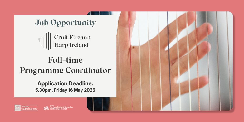 This position is available thanks to funding from The Heritage Council. If you would like to discuss this role, please contact Aibhlín McCrann, Chair, Cruit Éireann | Harp Ireland at aibhlin.mccrann@harpireland.ie