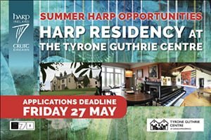 The residency includes both emerging and established harpers/harper composers in either the Traditional Arts or Music, living on the island of Ireland. Send your CV and a letter of application clearly outlining a rationale for ‘time spent’ at the Tyrone Guthrie Centre at Annaghmakerrig. Full details at https://www.harpireland.ie/summer-harp-opportunities-harp-residency-at-the-tyrone-guthrie-centre/