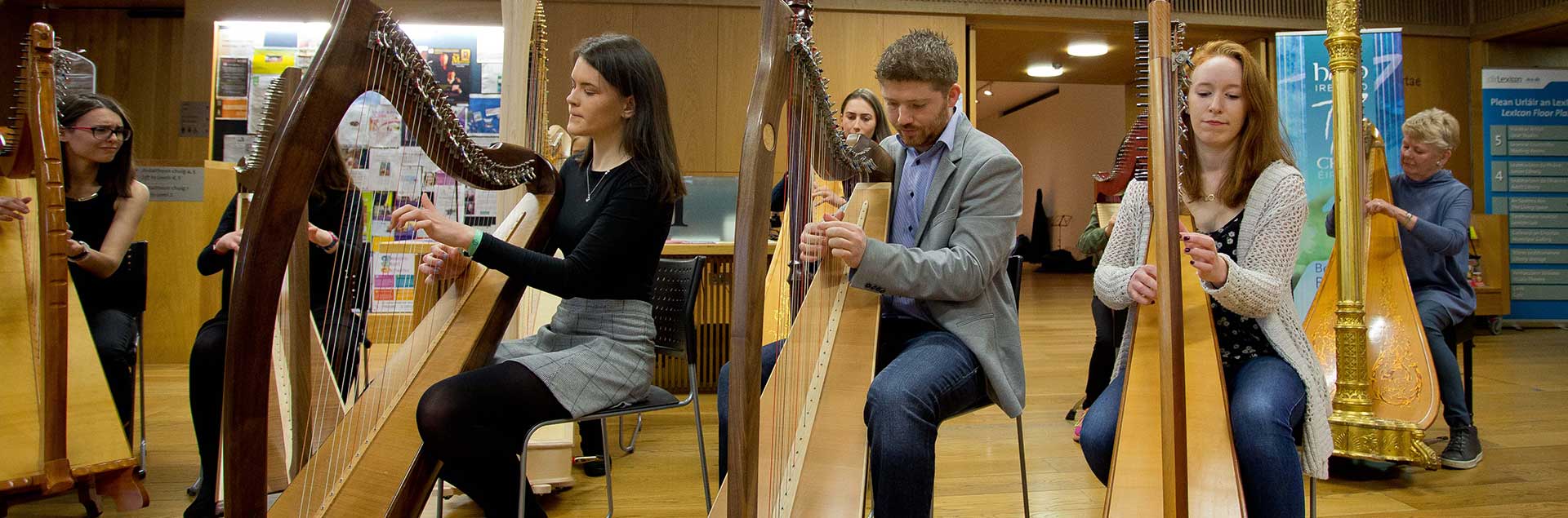 Third level institutions came in behind us with Limerick’s UL playing host to Fiana Ní Chonaill and friends, presented by Dr Sandra Joyce. DKIT heard young harpers from Louth at its Music Education conference. DIT Conservatory of Music harpers performed in the Powerscourt Centre in Dublin and the RIAM harpers joined us in the Lexicon in Dún Laoghaire – our special thanks to DLR Co Co and its Library Service, who gave us wonderful support throughout the day for the harp marathon, and where we heard a wonderful variety of performances including the beguiling sounds of the early harp.