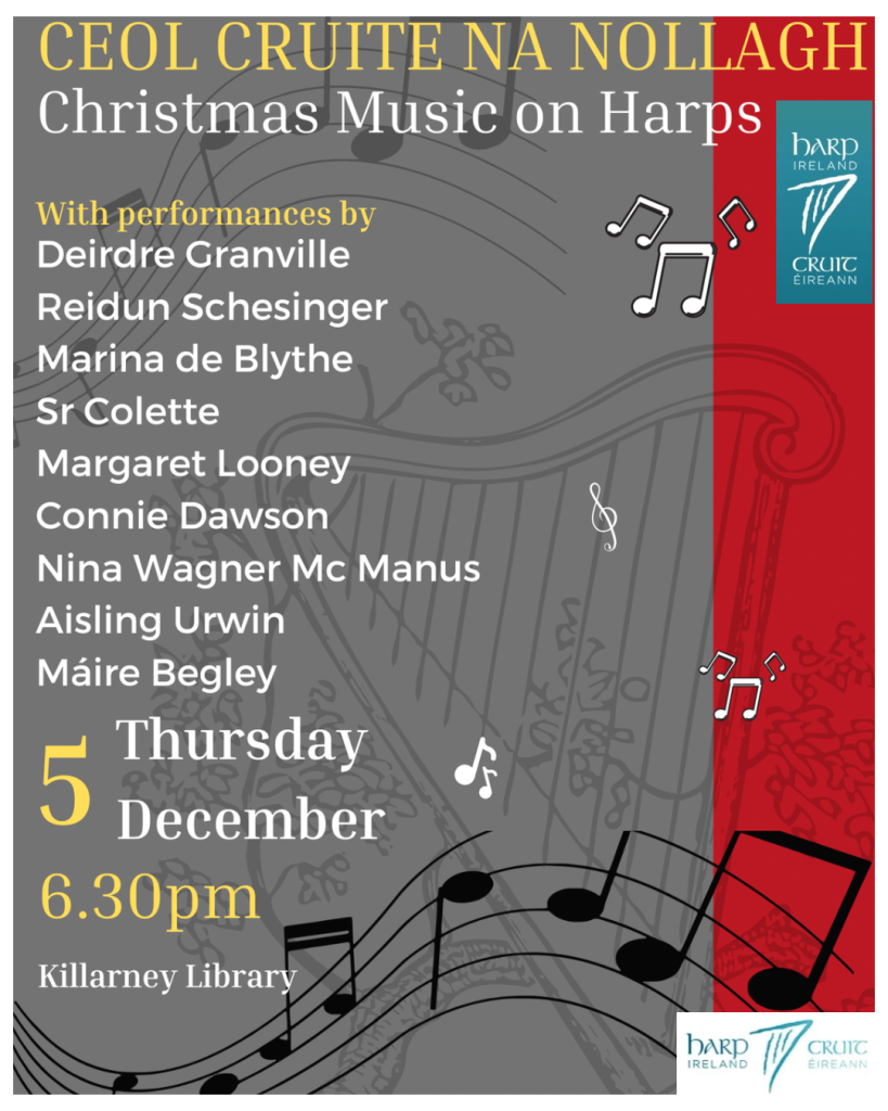 Join Deirdre Granville, Reidun Schlesinger, Marina de Blythe, Sr. Colette, Margaret Looney, Connie Dawson, Nina Wagner McManus, Aisling Urwin and Máire Begley on 5th December. 6.30 pm for an evening of seasonal music at Killarney Library.