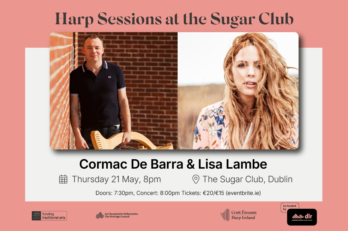 Two leading voices in Irish music, harper Cormac De Barra and singer Lisa Lambe, perform at Harp Sessions at The Sugar Club, the second in our 2026 series. Cruit Éireann is proud to premiere their collaborative work, Macalla na Mara | Sea Echoes; a new composition for harp and voice, inspired by our deep connection to the sea and a response to climate change and rising sea levels. Commissioned by Cruit Éireann, with support from dlr County Council, Macalla na Mara is a new work by two renowned artists and an artistic response to current challenges to the environment. Set in the intimate and iconic surroundings of The Sugar Club in the heart of the city, this concert also features music that reflects the rich harping tradition and explores contemporary Irish song and harp from two consummate performers.