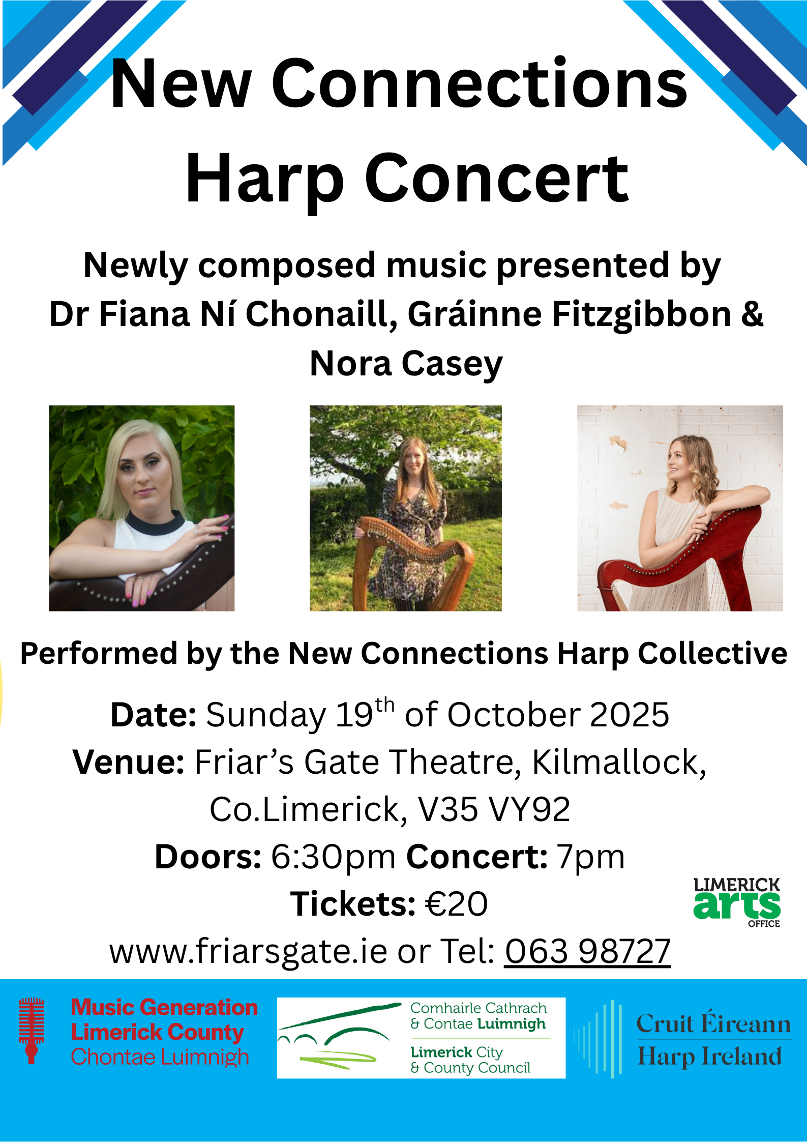 The ‘New Connections Harp Concert’ is a presentation of newly composed music written by Dr Fiana Ní Chonaill in collaboration with Gráinne Fitzgibbon and Nora Casey. Inspired by their backgrounds and connection with Limerick they have come together to explore their musical creativity and are proud to debut the finished performance as part of Harp Day 2025. This will be performed by the ‘New Connections Harp Collectiveiverse harping backgrounds for the premiere of this music.
