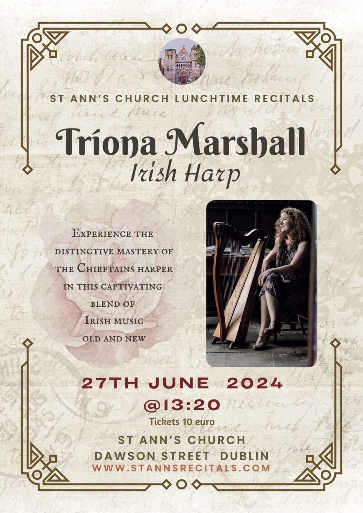 As part of St. Ann's Lunchtime Recital Series, Tríona Marshall will perform a concert of harp music on 27th June at 13.20.