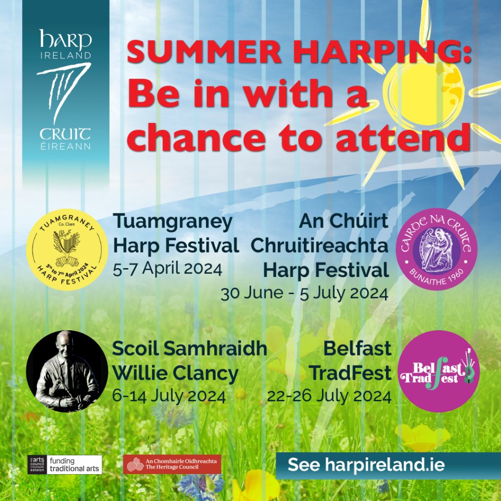 Cruit Éireann | Harp Ireland in partnership with Tuamgraney Harp Festival, Cairde na Cruite, Scoil Samhraidh Willie Clancy and Belfast TradFest are delighted to announce a range of sponsored harper opportunities this summer to support the rapidly growing interest in Irish harping.