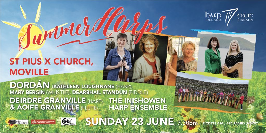 Cruit Éireann | Harp Ireland are delighted to announce our Summer Harps series in Moville, Co. Donegal on 22 – 23rd June 2024 which will feature two harp workshops and a concert with Dordán, Deirdre Granville (harp), Aoife Granville (flute) and The Inishowen Harp Ensemble.